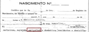 Abaixo, colocamos um exemplo de uma certidão de nascimento em que o pai consta como “agricultor”: